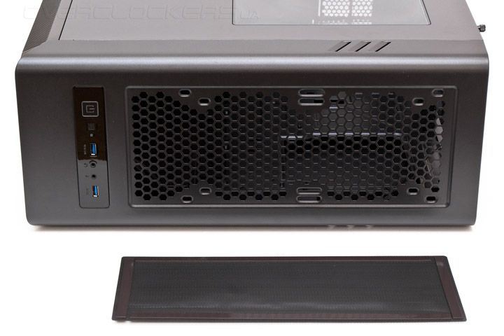 Не в пример многим другим корпусам компании, верхняя панель в Aero-1000 металлическая. Большую ее часть занимает вентиляционная решетка, закрытая металлическим пылевым фильтром. А в передней части находится панель с внешними портами и кнопками управления стартом системы.