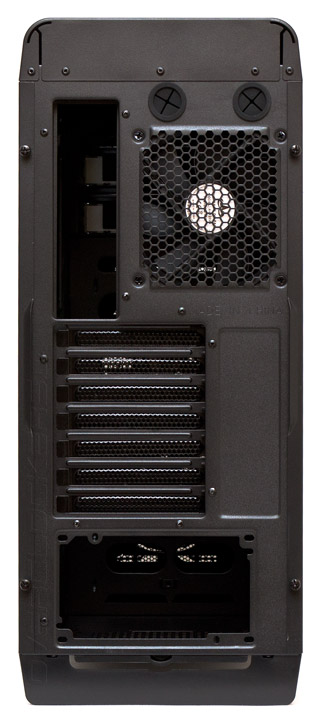 Задняя панель вполне стандартная. Вверху есть два прорезиненных 1″ отверстия для шлангов СВО. Под ними расположена решетка с предустановленным на выдув 120-мм вентилятором. Семь слотов расширения PCI закрыты многоразовыми вентилируемыми заглушками.