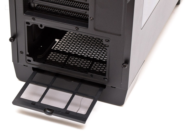 Блок питания можно ориентировать как вентилятором вверх, так и вниз. Под ним есть выдвижной пылевой фильтр, состоящий из качественной мелкой сеточки, натянутой на пластмассовую рамку.