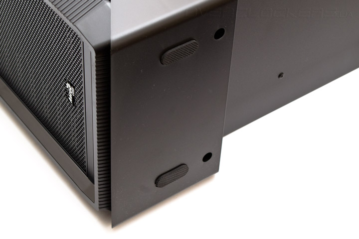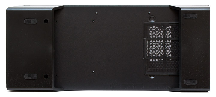 На дне корпуса нет ничего примечательного. Оно сплошное и ровное, если не считать вентиляционного отверстия блока питания. Ножки образуются двумя пластиковыми скругленными «крыльями» высотой в 40 мм, чего более чем достаточно для нормальной вентиляции БП.