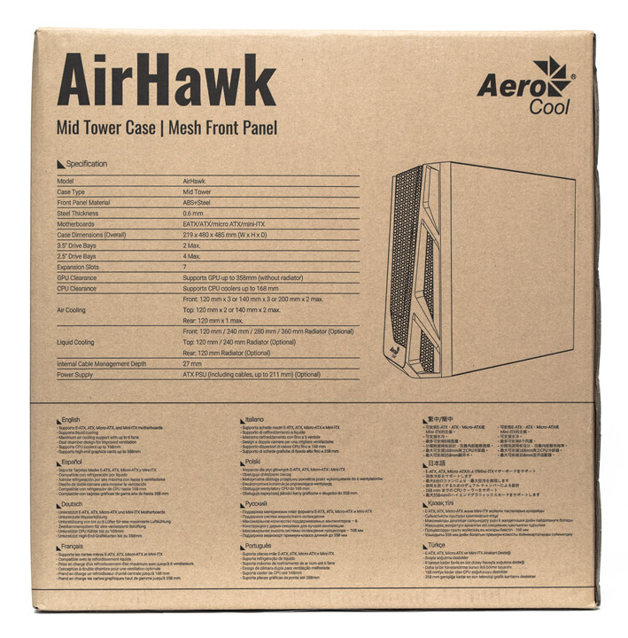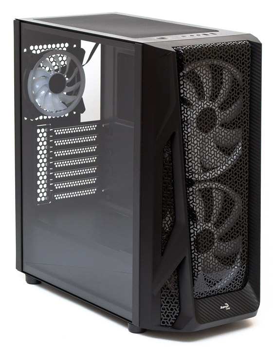 В ассортименте Aerocool есть пара корпусов близнецов. Называются они AirHawk и NightHawk. Встречаются в обычных вариантах и в версии Duo, с 200-мм вентиляторами с подсветкой. А единственное различие между этими шасси состоит в том, что у AirHawk решетчатая передняя панель, для лучшей вентиляции, а у NightHawk фронт прозрачный и акриловый (не спрашивайте зачем). Мы запросили себе для обзора вариант AirHawk Duo и, не считая отличий в вентиляции, информация из данной статьи будет актуальна в отношении остальных моделей.