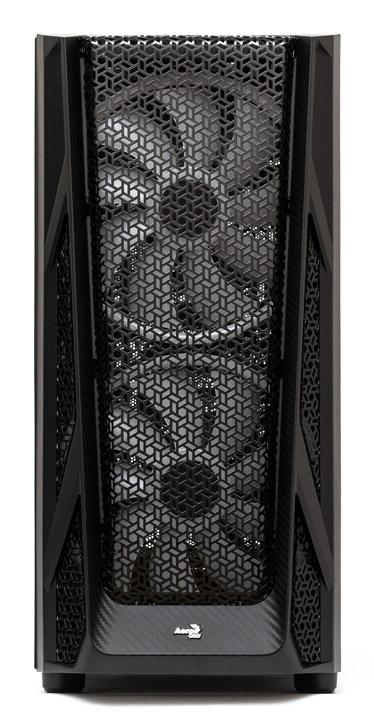 Сам корпус выглядит как ровная металлическая коробка правильной формы, и наиболее выдающейся его частью является фронтальная панель. Обод накладки пластиковый, с зауженным верхом и массивным «подбородком» снизу (на котором наклеен логотип). На внутренней его стороне даже есть текстура, стилизованная под карбон. Все остальное место по бокам и спереди занимает металлическая решетка с крупными ячейками в виде трапеций и шестиугольников. За решеткой видны два 200-мм вентилятора с белыми лопастями и подсветкой.