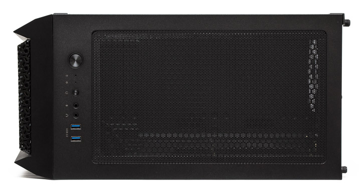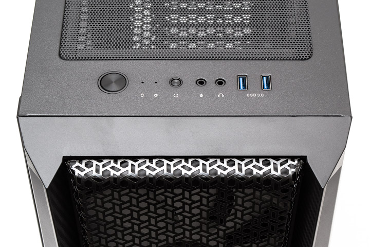 Внешние порты и кнопки расположены в передней части верхней панели. Тут есть большая круглая клавиша запуска ПК, два точечных индикатора активности накопителей и питания системы, маленькая круглая кнопка для управления подсветкой или перезагрузки системы (смотря как подключить), два 3,5-мм разъема под микрофон и наушники и два разъема USB 3.0.