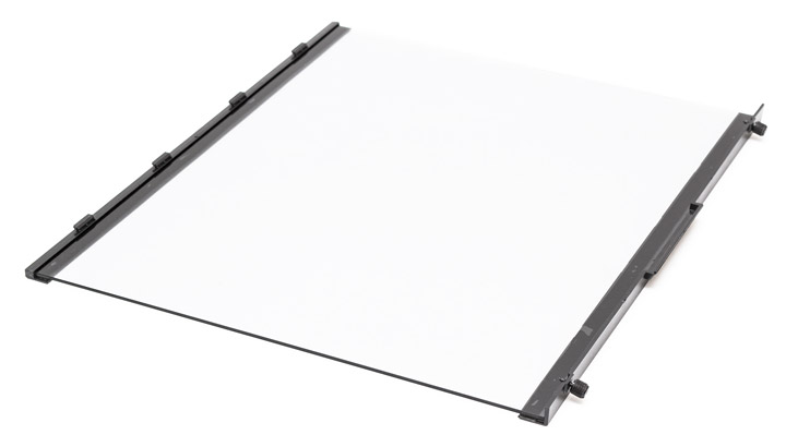 Закаленное стекло прозрачное, толщиной в 3 мм. На боковых гранях приклеены пластиковые накладки с креплениями.