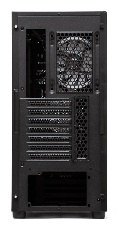 Задняя панель выглядит очень стандартно. Решетка вытяжного вентилятора с продолговатыми крепежными отверстиями, за которой прячется предустановленный 120-мм пропеллер. Семь слотов PCI прикрыты одноразовыми вентилируемыми заглушками. Декоративная планка справа от слотов откидывается в сторону и тоже имеет вид решетки. Место для блока питания находится снизу и ставить его можно исключительно вентилятором вниз.