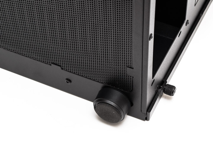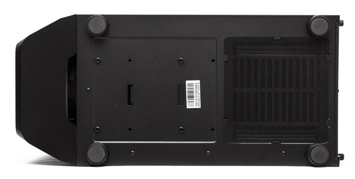 На основании корпуса сзади металлической сеточкой закрыт от пыли воздухозаборник блока питания. В центральной части днища находятся винты и отверстия для крепления корзины накопителей в двух положениях. Впереди есть прорезь для демонтажа фронтальной панели.
