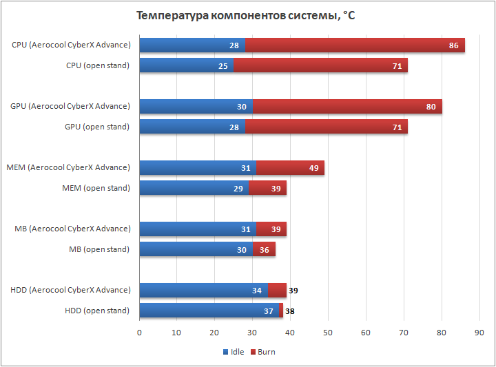 По части охлаждения компонентов Aerocool CyberX Advance не показывает выдающихся результатов, даже не смотря на наличие полного комплекта вентиляторов в стоке. Если нагрев видеокарты на 9 градусов относительно открытого стенда можно считать приемлемым, то процессору приходится тяжело, ведь он охлаждается хуже на 15 градусов из-за того, что через его радиатор проходят все горячие воздушные потоки. Застой воздуха в верхней части корпуса подтверждают и показатели температур оперативной памяти. Одним словом, удел этого шасси — средние и слабые по мощности системы, без разогнанных компонентов.