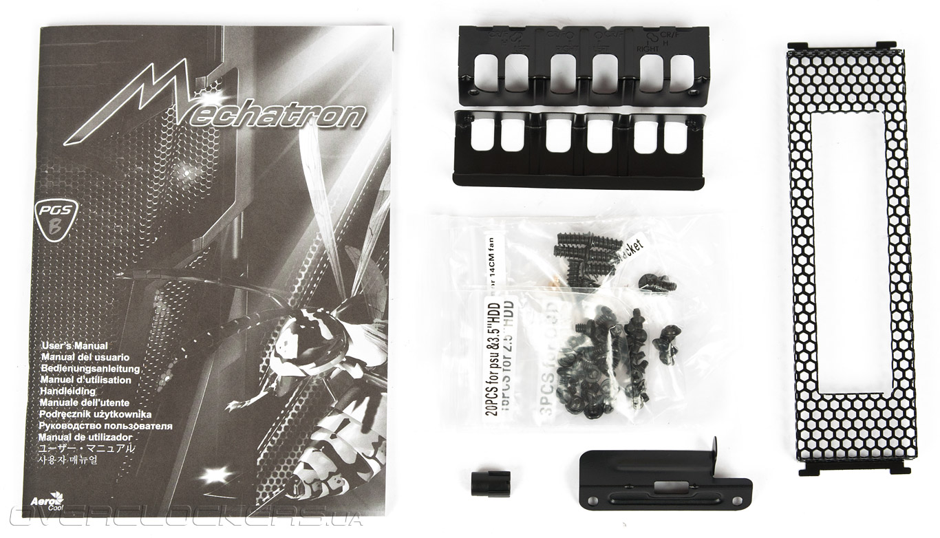 Богатый набор аксессуаров упакован в картонную коробку, закрепленную в одном из отсеков для жестких дисков. Инструкция по особенностям сборки на 11 языках (русский присутствует) прилагается. Все детали расфасованы по отдельным пакетикам.