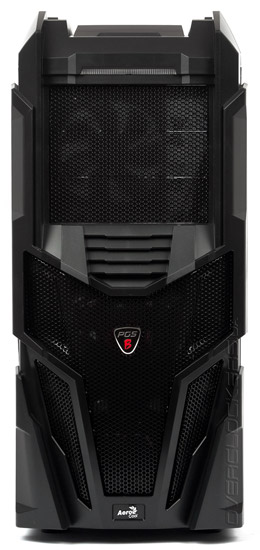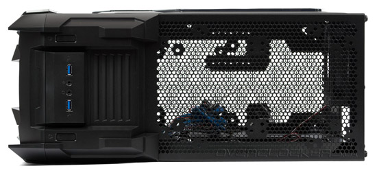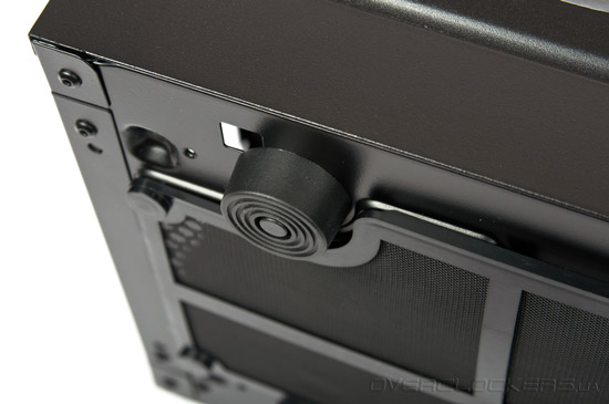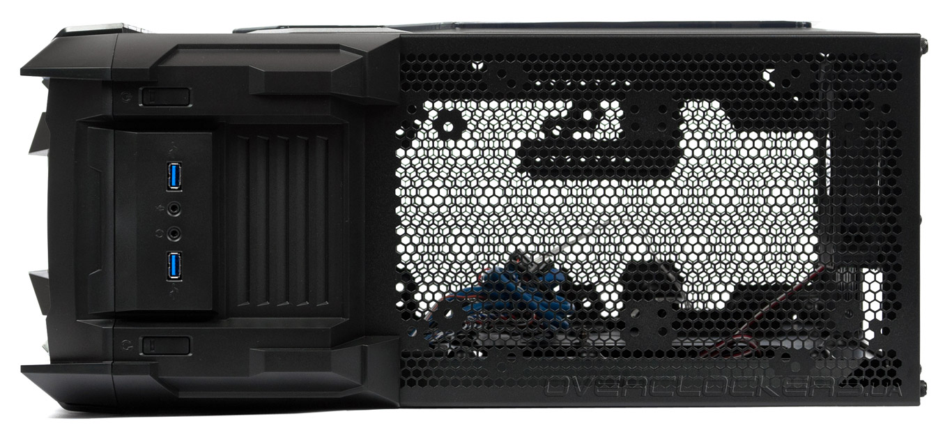 С первого взгляда на нее возникает предположение, что вентиляторы здесь не нужны, поскольку 65% поверхности заняты перфорированной крупноячеистой решеткой. Эту гипотезу мы проверим чуть позже. Сетка на верхней панели непрочная, легко прогибается при нажатии пальцами и ощутимо передает вибрации. Пыль легко проникает через нее внутрь, когда ПК выключен.