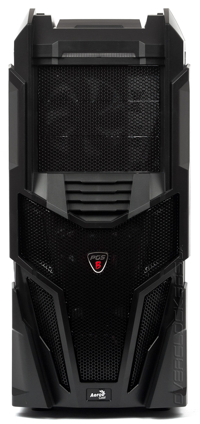 На передней панели есть три заметных элемента — логотип производителя снизу, шильдик серии посередине, и полоска светодиода красного цвета сверху. Три отсека 5,25” закрыты вентилируемыми заглушками, которые удерживаются на месте двумя пластиковыми защелками. Прочность такого крепления вызывает определенные сомнения.