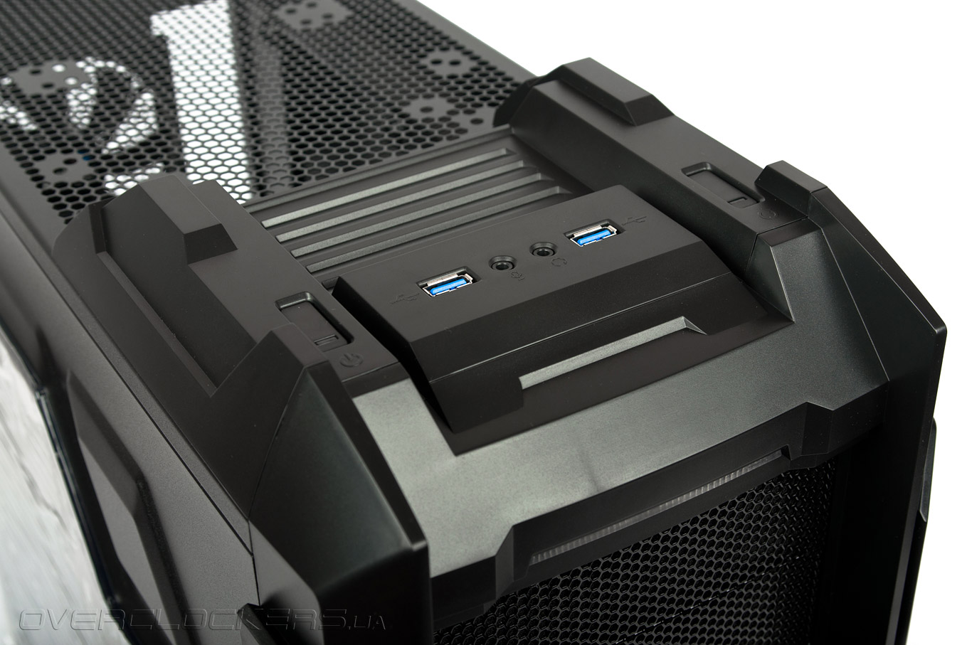 Оставшееся место сверху занимает декоративный пластиковый «нарост». На него вынесены внешние интерфейсы — два USB 3.0, разъемы 3,5 мм для наушников и микрофона, клавиши сброса и включения со встроенными индикаторами питания и активности накопителей.