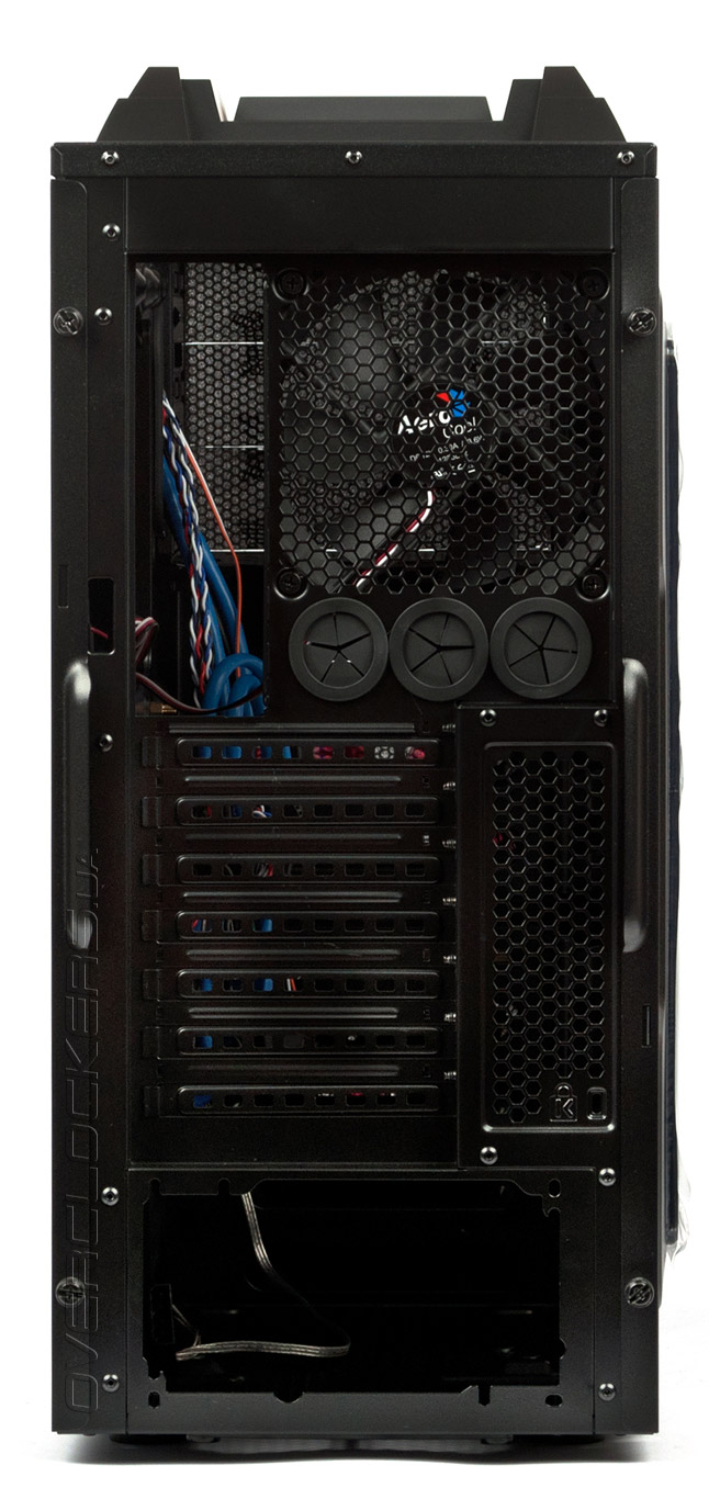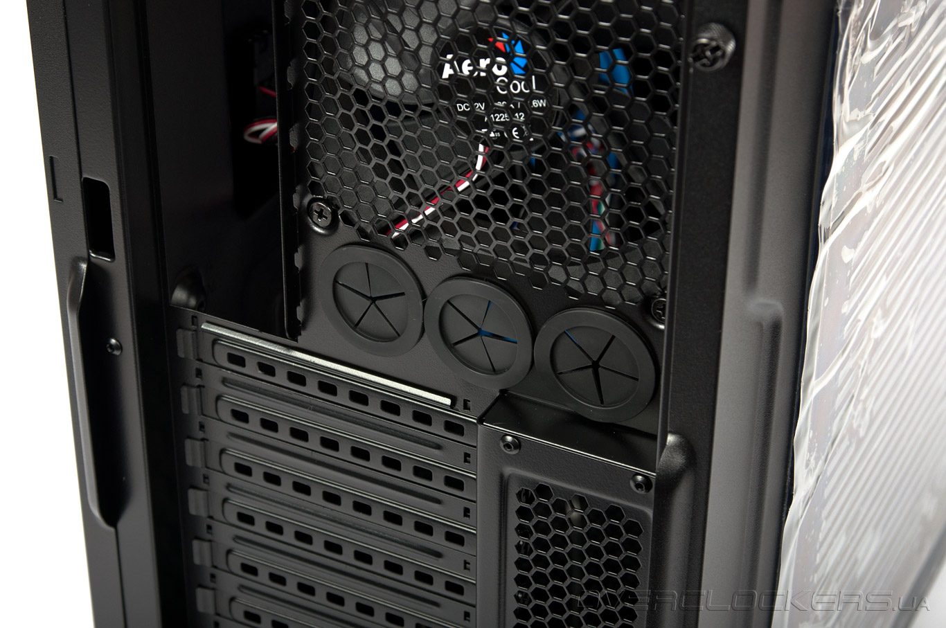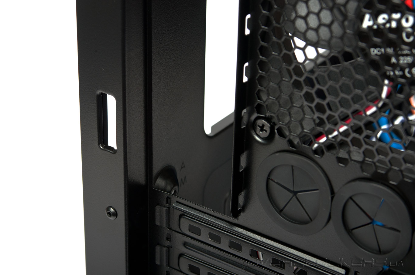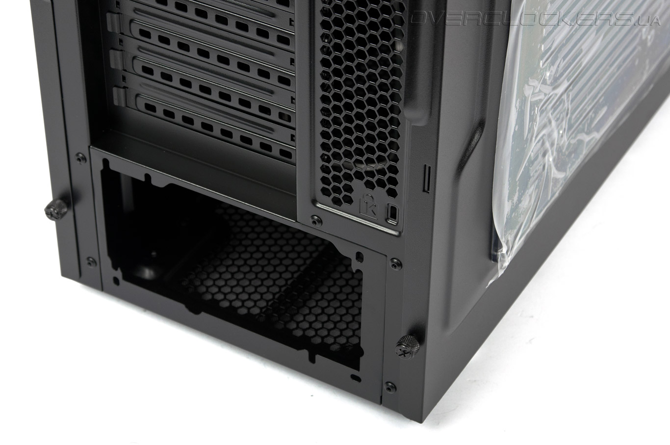 Слева видно прямоугольное отверстие — атавизм, предназначенный для вывода кабеля USB 3.0 с целью внешнего подключения, однако, в этом корпусе данный интерфейс подключается непосредственно к материнской плате. Вырезы в вертикальной поперечной планке упрощают установку задней заглушки материнской платы.