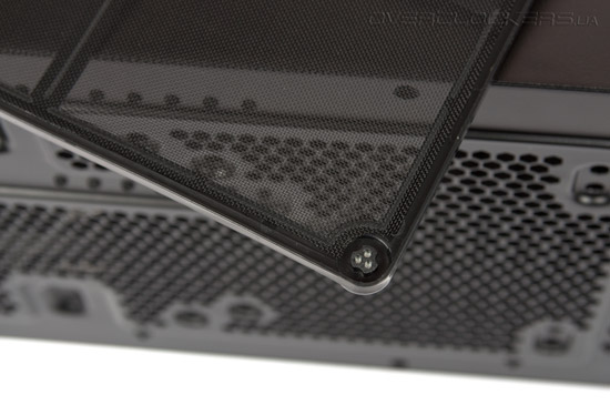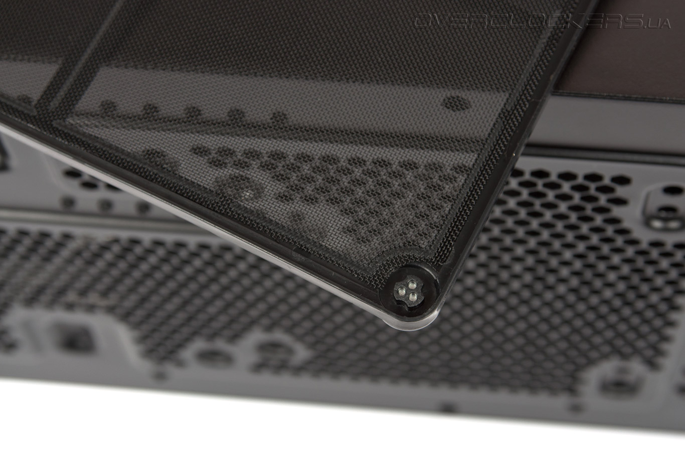 Сетка достаточно мелкая чтобы ловить пыль. Магниты держат хорошо. Посередине днища есть посадочное место для 120-мм или 140-мм вентилятора. Учитывая его расположение «на вдув», пылевой фильтр здесь просто необходим.