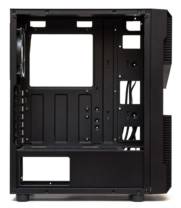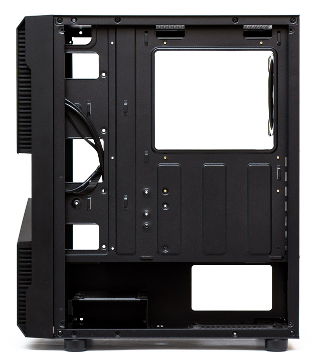 В поддоне материнской платы есть крупный вырез для усилительной пластины кулера, шесть отверстий для проводов и десяток проушин для крепления кабельных стяжек. Два накопителя формата 2,5″ можно прикрутить винтами на лицевую сторону поддона спереди. Запас пространства по ширине до боковой дверцы составляет от 15 мм сзади до 20 мм спереди.