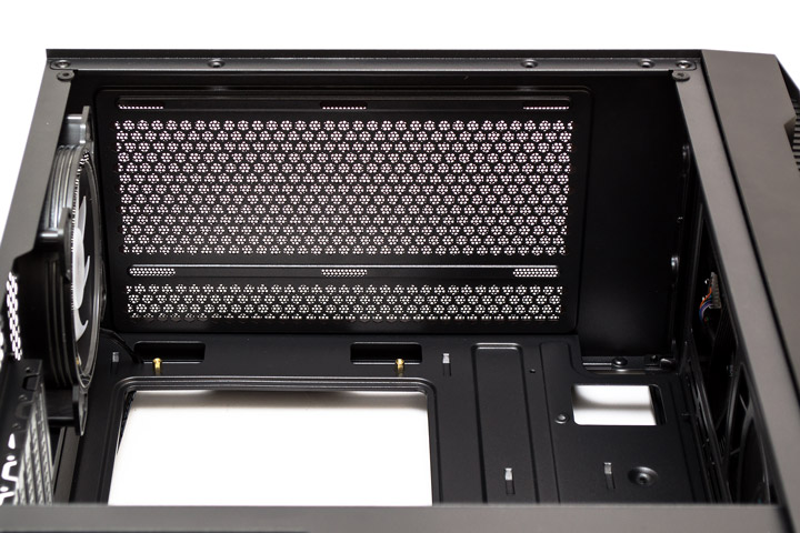 Кожух блока питания полностью перфорирован в своей верхней части, и служит скорее в декоративных целях и для увеличения прочности шасси. На верх можно закрепить два 120-мм вентилятора для обдува видеокарты (правда в комплекте нет подходящих винтов). Возле поддона есть два отверстия для укладки проводов. Сзади сбоку сделано отверстие, чтобы было видно наклейку блока питания. Вырез спереди позволит установить не только вентиляторы, но и радиатор СВО. Его глубина равна 60 мм.
