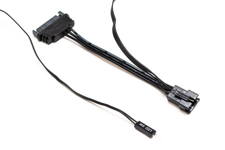 Вентилятор имеет нестандартное подключение в виде собственного варианта четырехконтактного разъема длиной 550 мм. К нему можно присоединить второй пропеллер. А само питание осуществляется через Power SATA (шнур длиной 100 мм). Второй 550-мм кабель имеет два контакта и используется для переключения подсветки. Его можно замыкать вручную, а можно подключить к кнопке Reset.