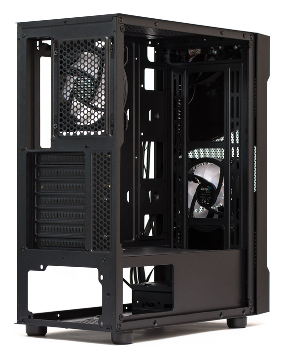 На задней панели предустановлен на выдув 120-мм вентилятор с 12 изогнутыми лопастями. Это Aerocool Saturn 12F со скоростью вращения 1000 об/мин и гидравлическим подшипником. Вентилятор имеет АRGB-подсветку на семь базовых цветов и шесть световых эффектов. Диоды подсветки находятся как вокруг статора, так и в рамке, которая просвечивается по бокам и спереди. Семь слотов расширения крепятся обычными винтами.