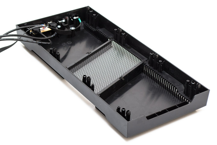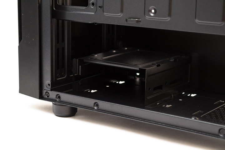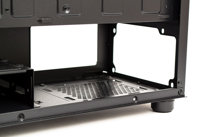 На основании корпуса есть вентиляция для блока питания, прикрытая простенькой сеточкой металлического пылевого фильтра. В передней части находится вырез для демонтажа фронтальной панели и два винта, удерживающих корзину накопителей, которую, судя по отверстиям, можно фиксировать в двух положениях. Четыре круглые пластиковые ножки расположены по углам шасси.