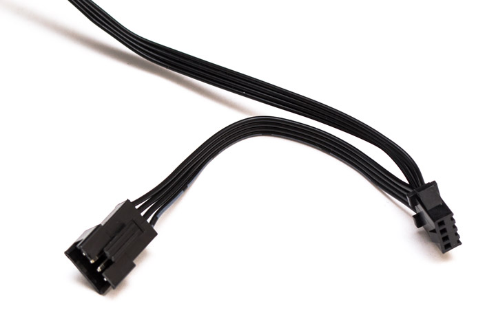 Он имеет один собственный специфичный разъем питания на четыре контакта, который подключается к заднему вентилятору. Длина шнура — 550 мм и еще 100 мм до второго сквозного выхода.
