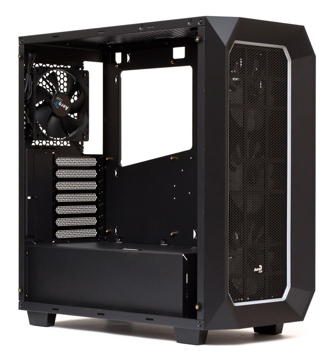 Сзади у корпуса «все как у всех». На посадочное место за решеткой справа можно установить один пропеллер формата 120 или 140 мм. Семь слотов PCI закрыты вентилируемыми многоразовыми заглушками, которые держатся на обычных винтах. Отверстие справа от слотов закрытой декоративной Г-образной металлической задвижкой, которая удерживается одним винтом с накатанной головкой.