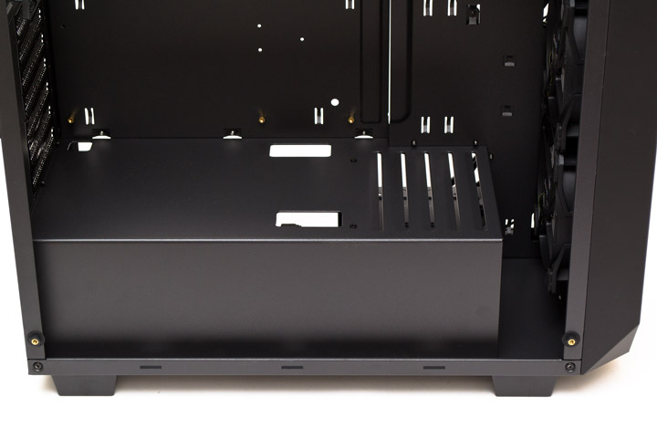 Кожух блока питания несъемный. В нем есть три отверстия разного размера для протяжки проводов и несколько прорезей для вентиляции жестких дисков. Слева от этих щелей есть два винта, удерживающие стенку корзины накопителей. Запас пространства впереди кожуха — 64 мм. Этого должно хватить для установки туда нешироких в профиль радиаторов систем СВО.