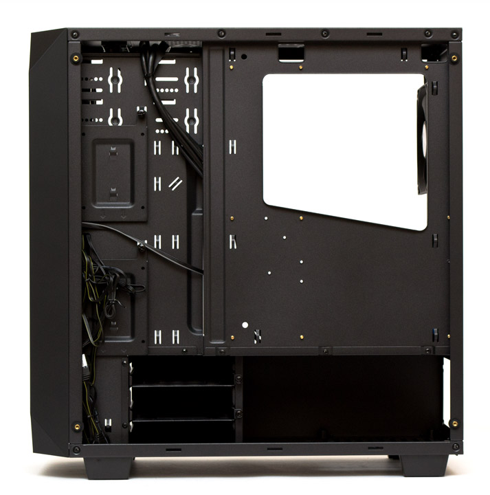 Правая боковина корпуса тоже полностью стеклянная и держится на четырех металлических винтах с накатанной головкой. С одной стороны, казалось бы, кому захочется смотреть на пучки проводов. А другой стороны, за сильной тонировкой все равно практически ничего не видно. Почти с тем же успехом можно было сделать эту панель непрозрачной.
