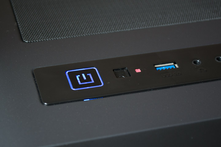 Внешние порты расположены на верхней панели впереди, на глянцевой пластиковой вставке. Тут есть большая квадратная кнопка старта системы с встроенным индикатором питания, мелкий квадратик клавиши перезагрузки, индикатор активности накопителей, два порта USB 3.0, между которыми встроены два 3,5-мм разъема аудио для наушников и микрофона.
