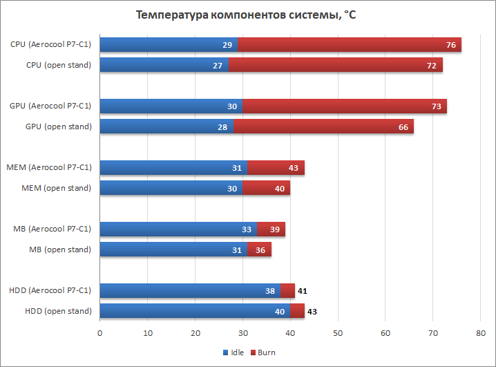 По эффективности охлаждения Aerocool P7-C1 с полным комплектом вентиляторов показывает средние результаты — не идеальные, но далекие от перегрева в целом. По температуре процессора, материнской платы и памяти проигрыш открытому стенду составляет всего три-четыре градуса, что есть незначительно. По видеокарте разбег составляет уже семь градусов, но для нее такой нагрев тоже не выходит за пределы нормы. Жесткий диск проветривается всего на два градуса лучше, чем на открытом стенде, и это указывает на затрудненную вентиляцию отсека накопителей. Таким образом, в Aerocool P7-C1 вполне можно поддерживать нормальную температуру системы средней или высокой мощности, при условии установки дополнительных вентиляторов.