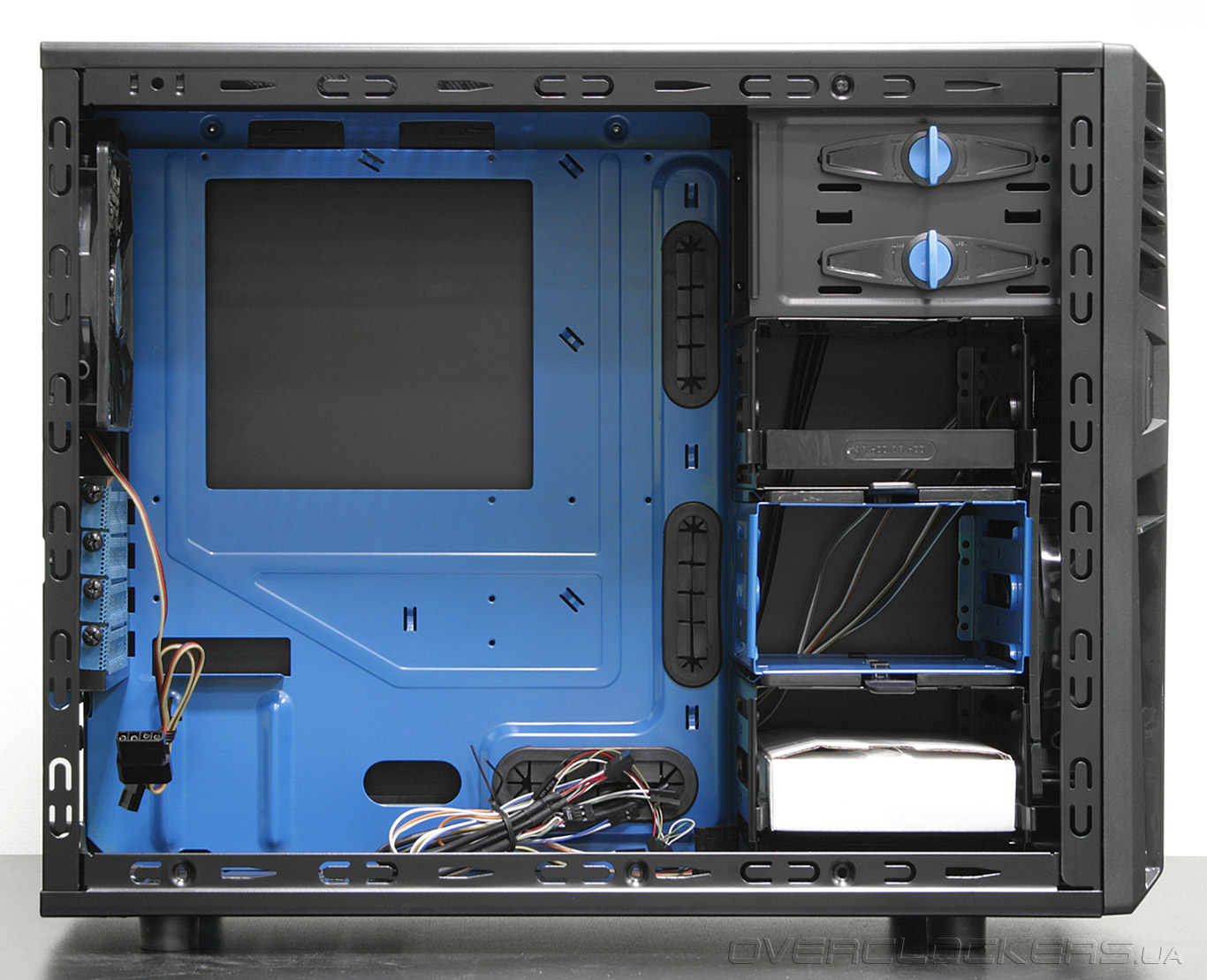 Боковые стенки снимаются на удивление легко. Традиционно для большинства современных корпусов, внутренняя поверхность окрашена, причем значительная ее часть покрыта не приевшимся черным или красным, а синим цветом. В поддоне для материнской платы имеется средних размеров отверстие, призванное упростить установку систем охлаждения ЦП с усилительными пластинами. Также предусмотрен ряд отверстий с резиновыми прокладками для аккуратной укладки кабелей за поддоном.