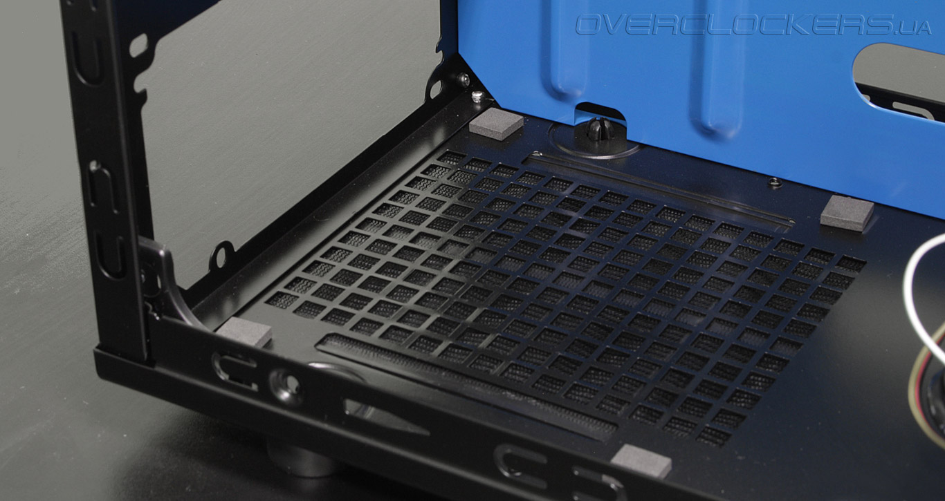В целом, внутренняя компоновка шасси абсолютно стандартна. Блок питания устанавливается в нижней части, причем его монтаж возможен в двух различных положениях. В местах контакта БП с нижней панелью наклеены мягкие прокладки.