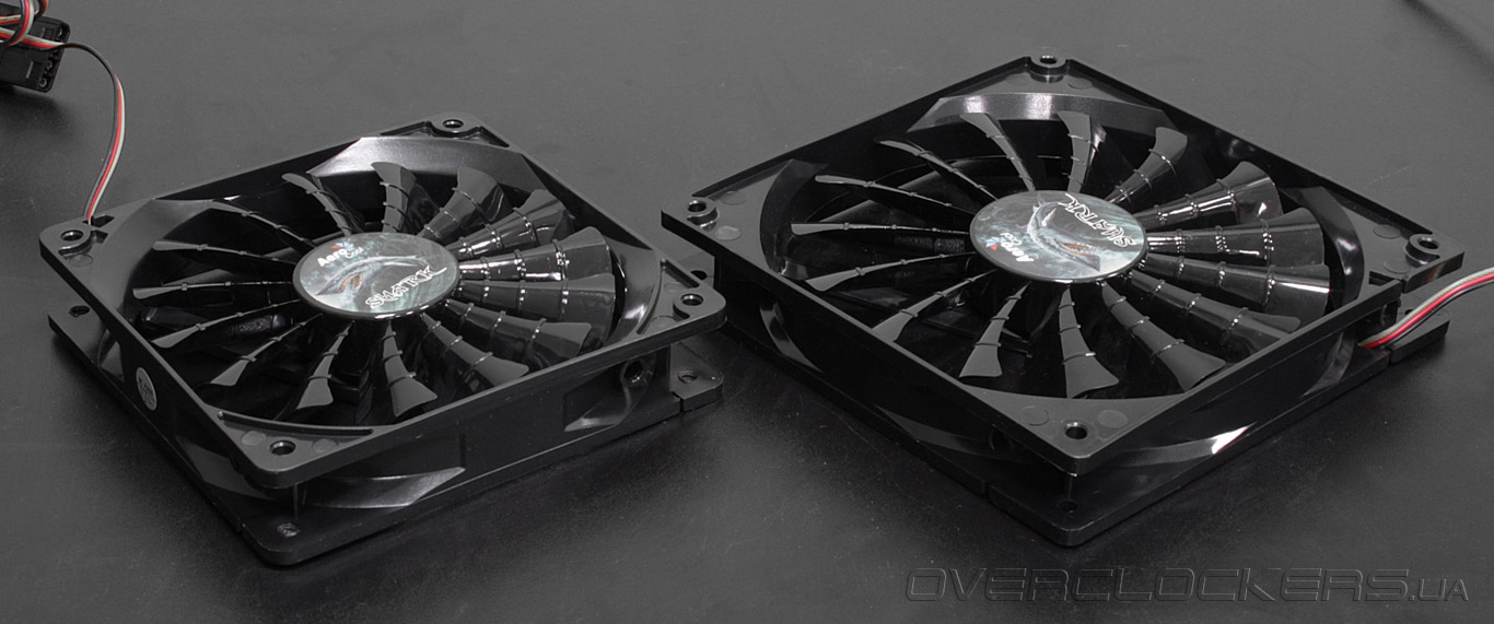 Оба штатных вентилятора относятся к серии Shark. Лопастей насчитывается 15, их форма отдаленно напоминает очертания акульих плавников. Согласно официальному сайту, вертушки работают на скорости до 1500 об/мин, организуя воздушный поток порядка 82,6 фут3/мин (120-миллиметровая модель) или 96,5 фут3/мин (140-миллиметровая модель), при этом уровень шума не должен превышать 26,5 и 29,6 дБА соответственно. Сложно определить, соответствуют ли приведенные выше данные, особенно относительно шумовых характеристик, действительности, но одно можно утверждать наверняка: внешний вид у «акул» просто отменный.