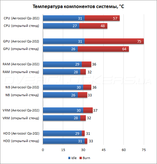 Очевидно, двух вентиляторов с внушительным количеством оборотов вполне достаточно для обеспечения приемлемого температурного режима для всех комплектующих. Традиционно, видеокарта чувствует себя намного лучше вне корпуса, однако и ее температура далека от критической. В рассматриваемом корпусе вполне можно разместить мощные топовые комплектующие без опаски за их работоспособность.