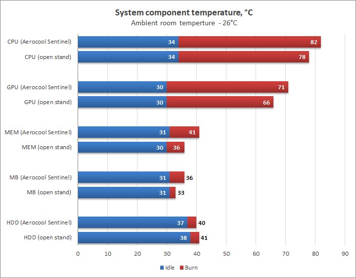 Результаты теста вызвали у меня бурный восторг. Почему? Да хоть у кого-то получилось сделать корпус с подсветкой не в ущерб охлаждению компонентов. Как для своих скромных размеров, Aerocool Sentinel хорошо вентилируется. Проигрыш открытому стенду по температуре процессора составил всего четыре градуса, а видеокарта и оперативная память нагрелась лишь на пять градусов больше. На материнской плате разрыв составил три градуса, а жесткий диск даже смог отыграть в корпусе один градус.