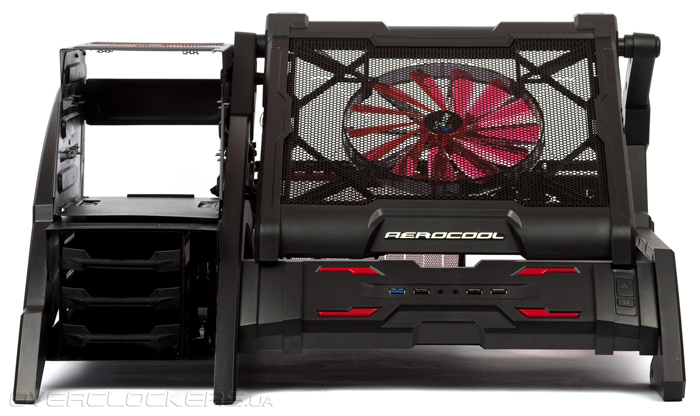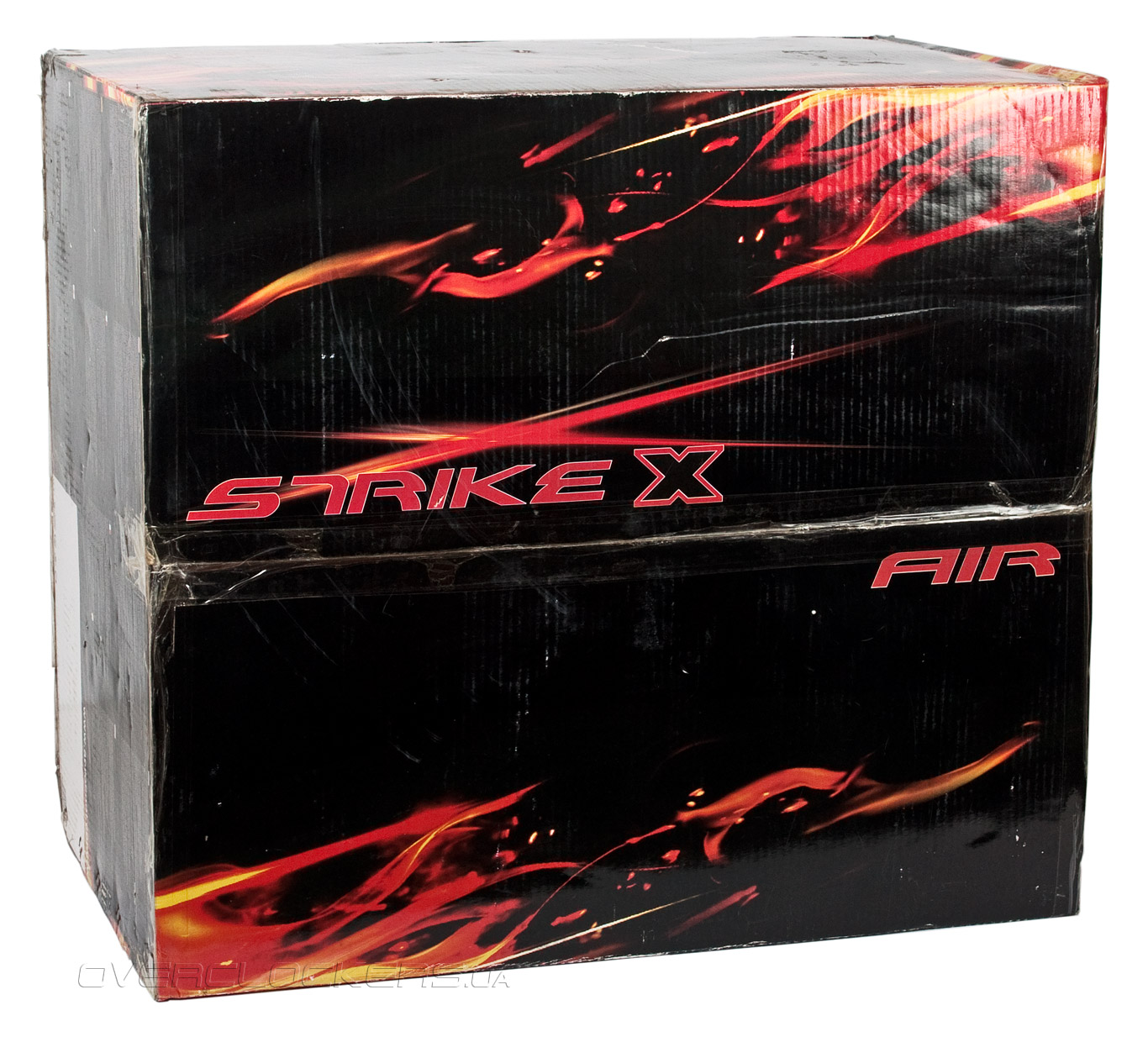 Дизайн полностью оправдывает название Aerocool Strike-X Air. Во внешности преобладает черный цвет с редкими красными вставками. Фигурные элементы в виде буквы Х расположились на двух верхних решетках, передней панели и ручках лотков для накопителей. Корпус состоит из трех отсеков. Справа отдел материнской платы. Слева снизу — продолговатый ящик для блока питания и жестких дисков.