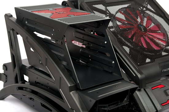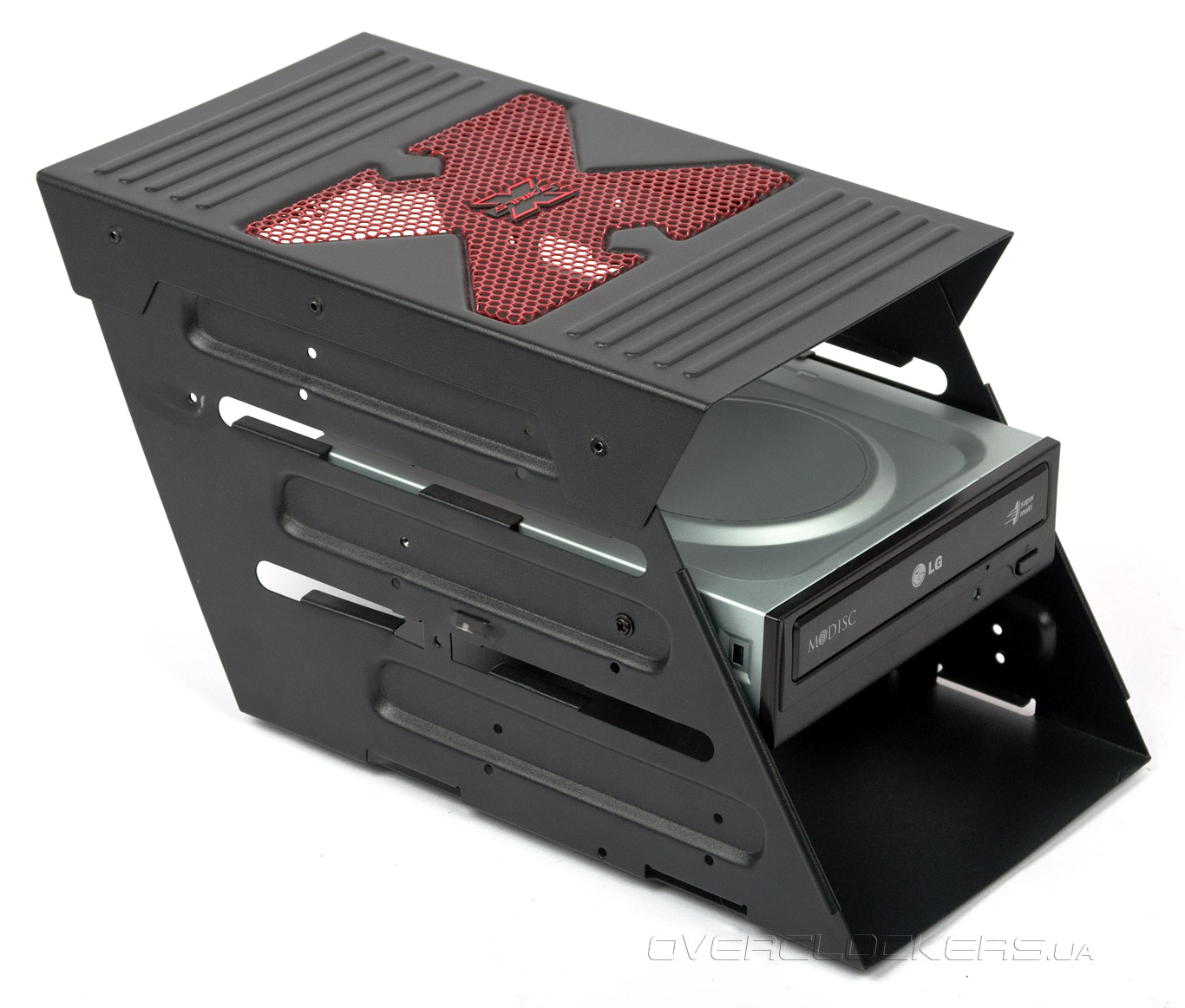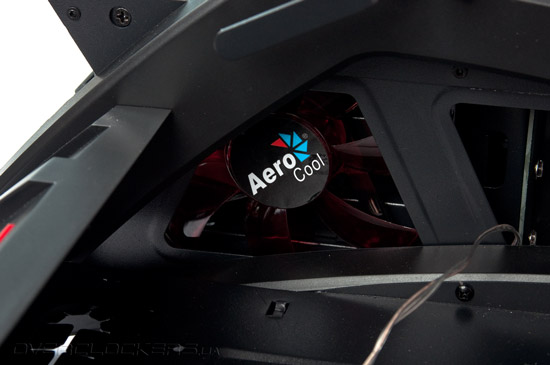 Справа от жестких дисков установлен стандартный 120-мм вентилятор с подсветкой красного цвета. Его максимальная скорость вращения — 1000 об/мин.