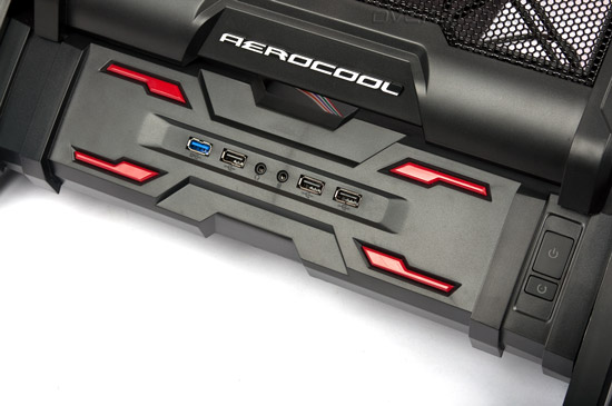 На панель передних интерфейсов выведены: один USB 3.0, три USB 2.0, микрофонный вход и выход на наушники. Справа расположены кнопки включения питания и перезагрузки со встроенными индикаторами активности, красного и синего цвета соответственно.