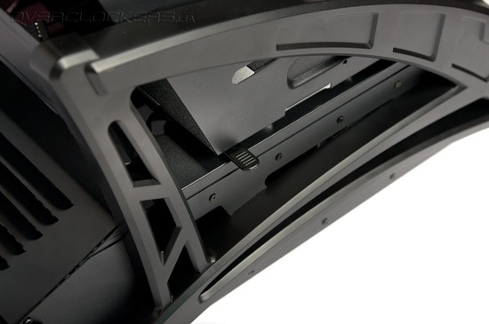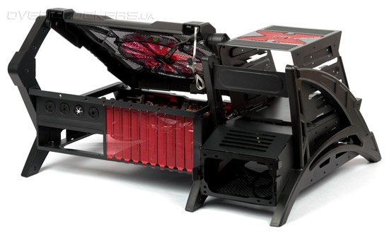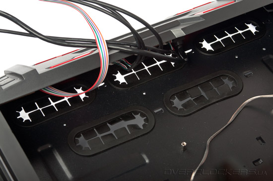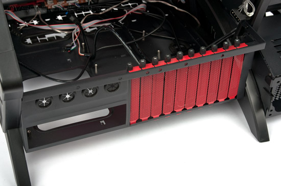 Задняя панель поддона материнской платы имеет четыре прорезиненных отверстия диаметром 20 мм для шлангов СВО. Слотов для карт расширения насчитывается десять штук, все закрыты сетчатыми заглушками красного цвета. Для крепления плат расширения предусмотрены винты с удобными пластиковыми барашками.