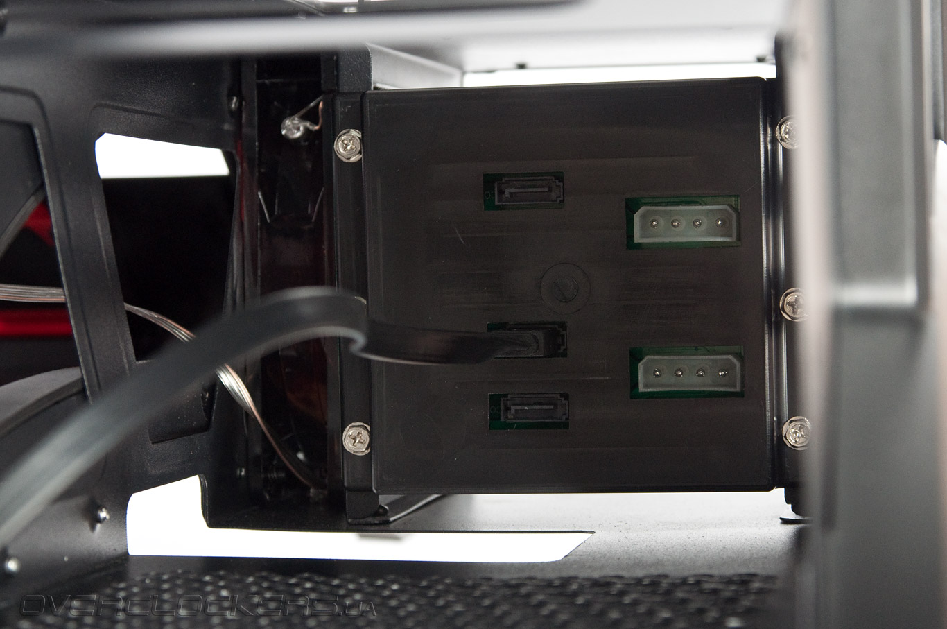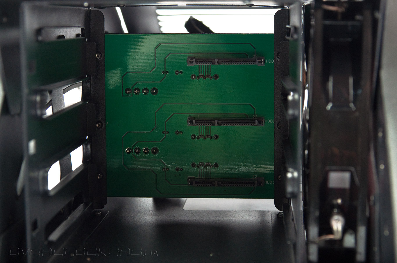 Посередине отсека установлена плата горячего подключения с двумя разъемами «молекс» и тремя SATA. Три сигнальных кабеля черного цвета присутствуют в комплекте.