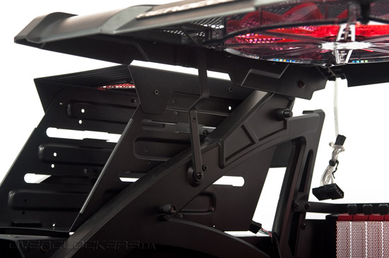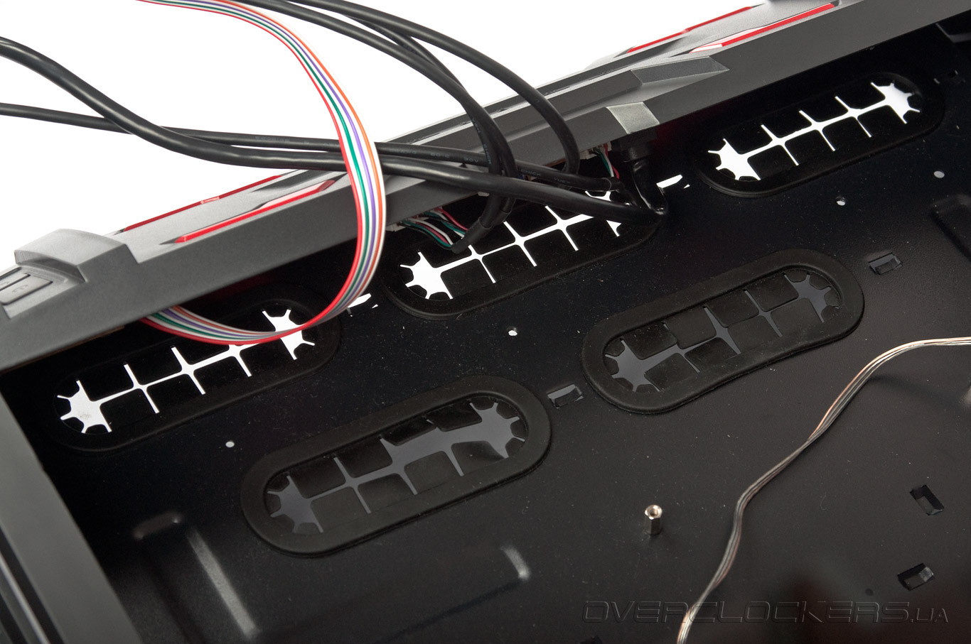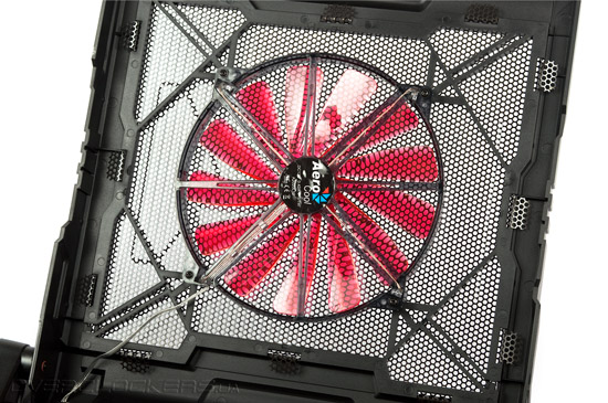 Верхняя крышка в основном представляет собой сетку, к которой прикреплен 200-мм вентилятор с красной подсветкой. Скорость вращения 750 об/мин.