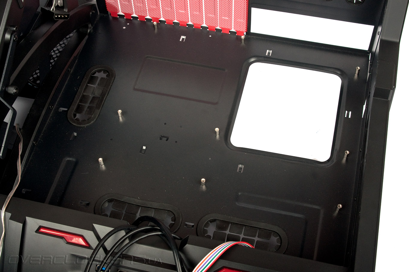 В поддоне, в районе процессорного разъема есть вырез, но его прямое назначение — скорее вентиляция тыльной части сокета чем установка усилительной пластины процессорного кулера. Для подобной операции этот стенд придется установить на торец или на бок, чего он может не выдержать. Правее выреза под усилительную пластину, есть прорезь для кабеля питания процессора. Спереди сделаны шесть прорезиненных отверстий для укладки проводов.