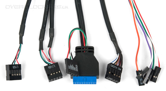 Набор кабелей подключения передней панели стандартный. USB 3.0 имеет разъем для включения непосредственно в материнскую плату и впаянный переходник на USB 2.0.