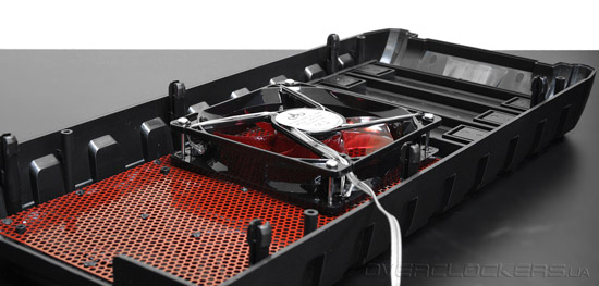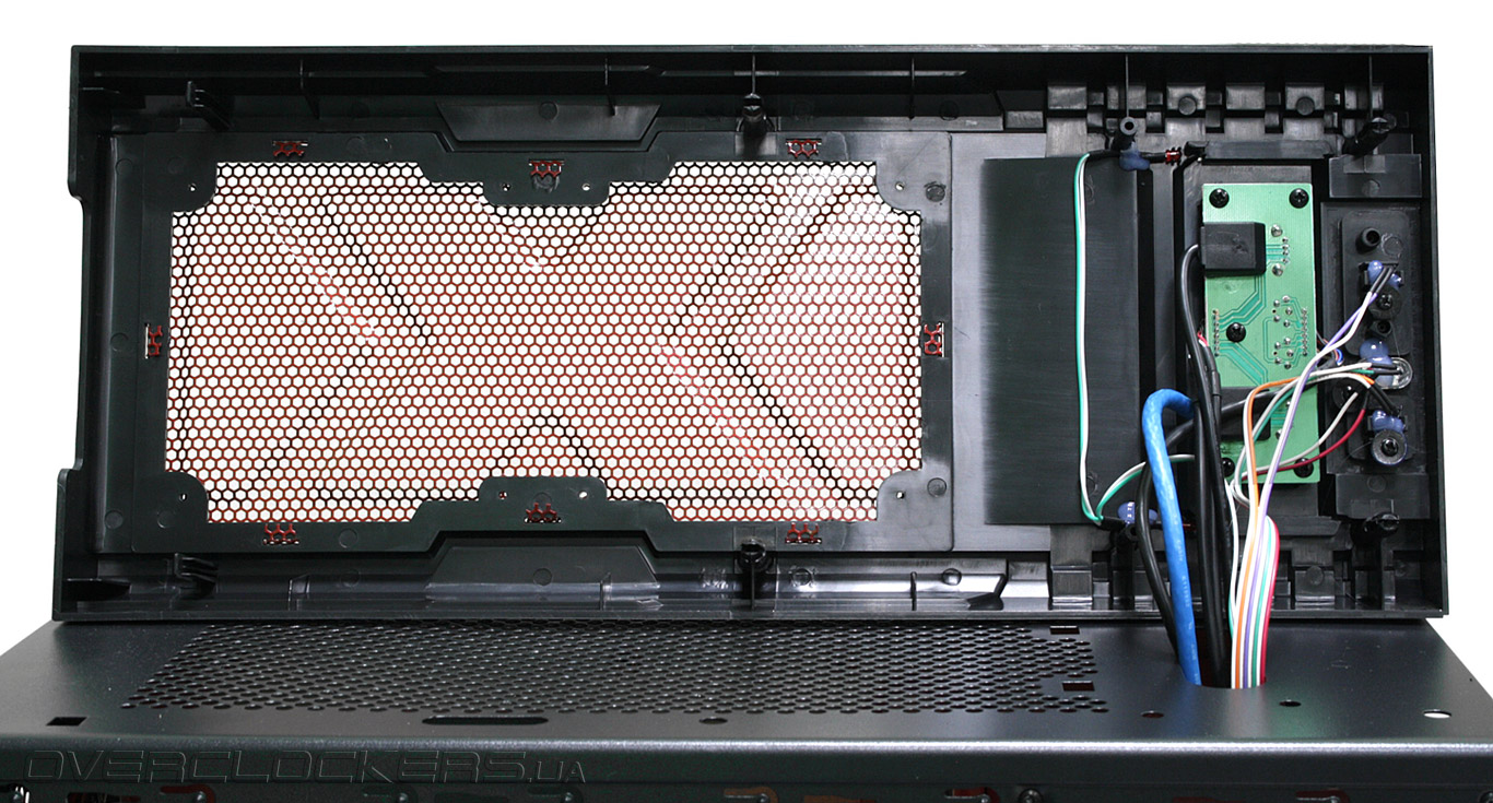 Верхняя часть корпуса выполнена из пластика. Значительных размеров вентиляционное отверстие усилено все той же красной штампованной решеткой.