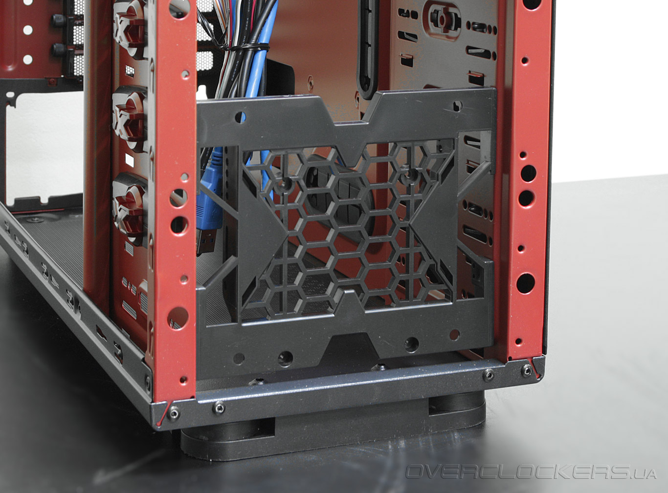 Большую часть нижней панели корпуса занимает вентиляционная решетка. Ножки у корпуса пластиковые, раздвижные. Путем поворота их на 90 градусов относительно боковой плоскости корпуса можно добиться значительного уровня устойчивости. Стоит отметить один негативный момент. Поскольку толщина стали применяемой в шасси составляет всего 0,6 миллиметров, что совсем немного, и данный факт усугубляется множественными отверстиями, то днище при нажатиях на него чуть «играет».