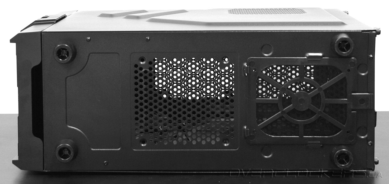 Значительную часть нижней панели корпуса занимают вентиляционные решетки — место под 120-мм вентилятор и вентиляционное отверстие блока питания, прикрытое пылевым фильтром. Ножки у корпуса выполнены из жесткого пластика, что негативно скажется на звукоизоляции системы при установки ее на стол. Стоит отметить еще один момент. Поскольку толщина стали применяемой в шасси составляет всего 0,5 миллиметров, что совсем немного, и данный факт усугубляется множественными отверстиями, то днище при нажатиях на него чуть «играет».