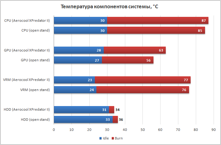 Тепловая нагрузка создавалась с помощью одновременной работы стресс-тестов LinX 0.6.5 с 6144 МБ выделенной памяти и MSI Кombustor 3.5.0.4 на протяжении 10 минут после стабилизации температуры. Нагрузка на жесткий диск производилась программой Crystal Disk Mark 5.2.1 х64. В конце цикла тестирования система работала 10 минут в холостом режиме для определения минимальных тепловых показателей. Температура окружающей среды равнялась 24 градусам Цельсия. Скорости вентиляторов процессорного кулера и видеокарты зафиксированы на максимальных оборотах. Пиковое энергопотребление системы составило 447 ватт. Тестирование проводилось в единственном режиме сравнения с открытым стендом. Все корпусные вентиляторы во время теста работали на максимальной скорости.