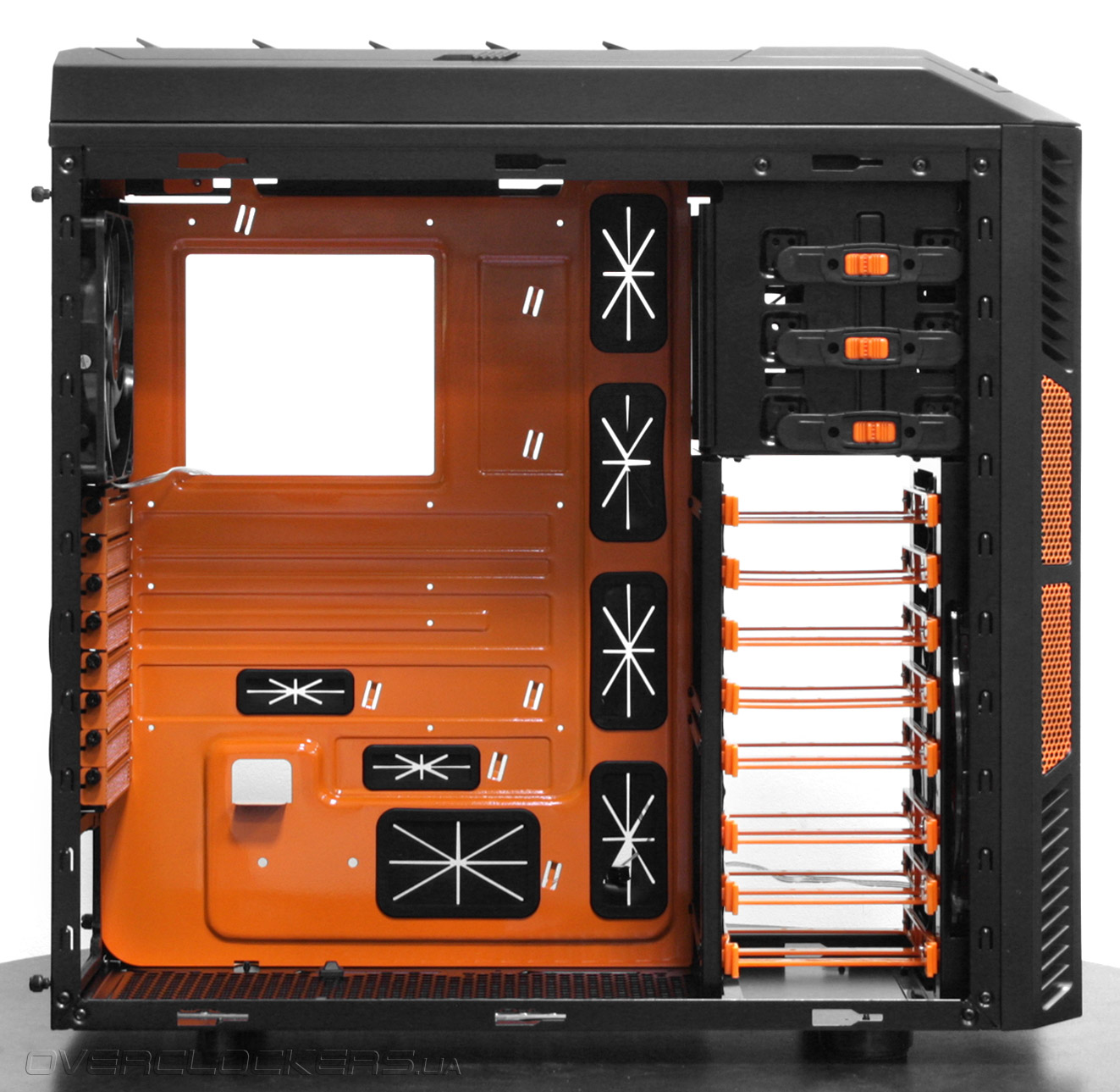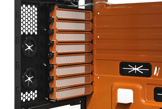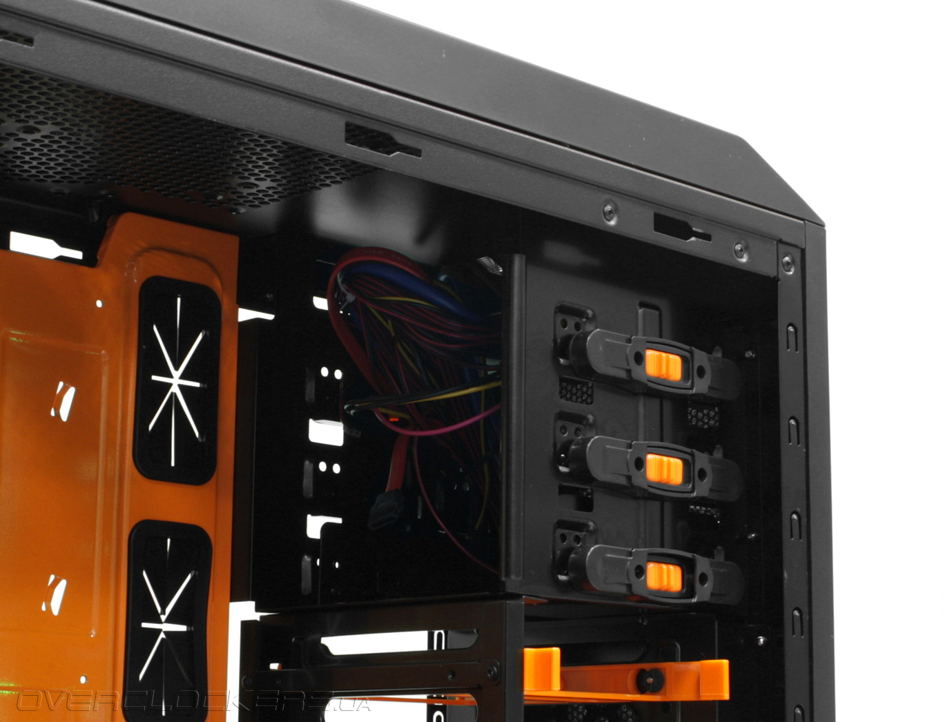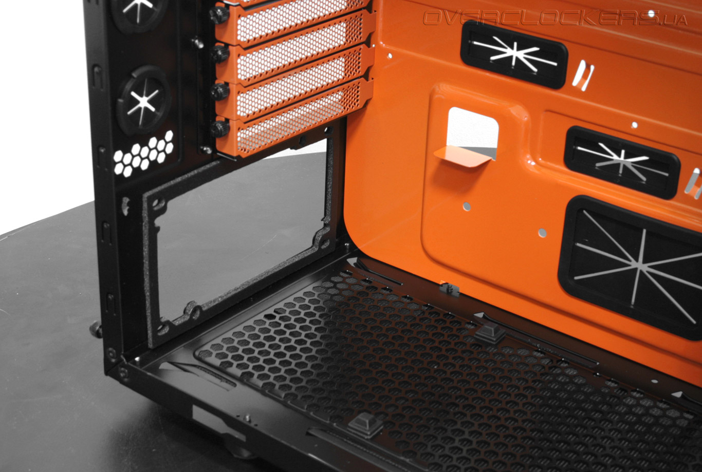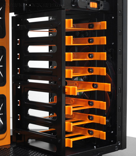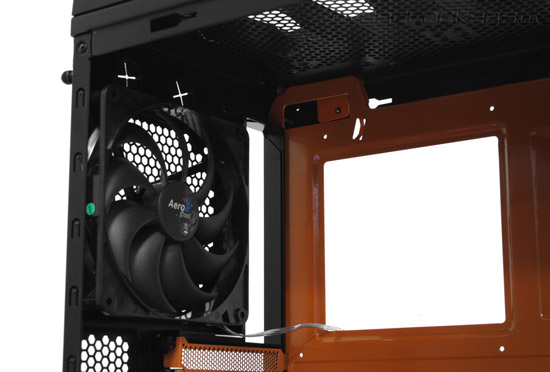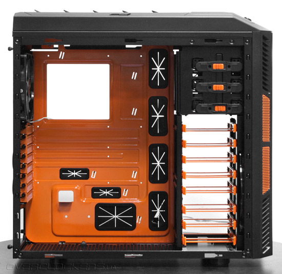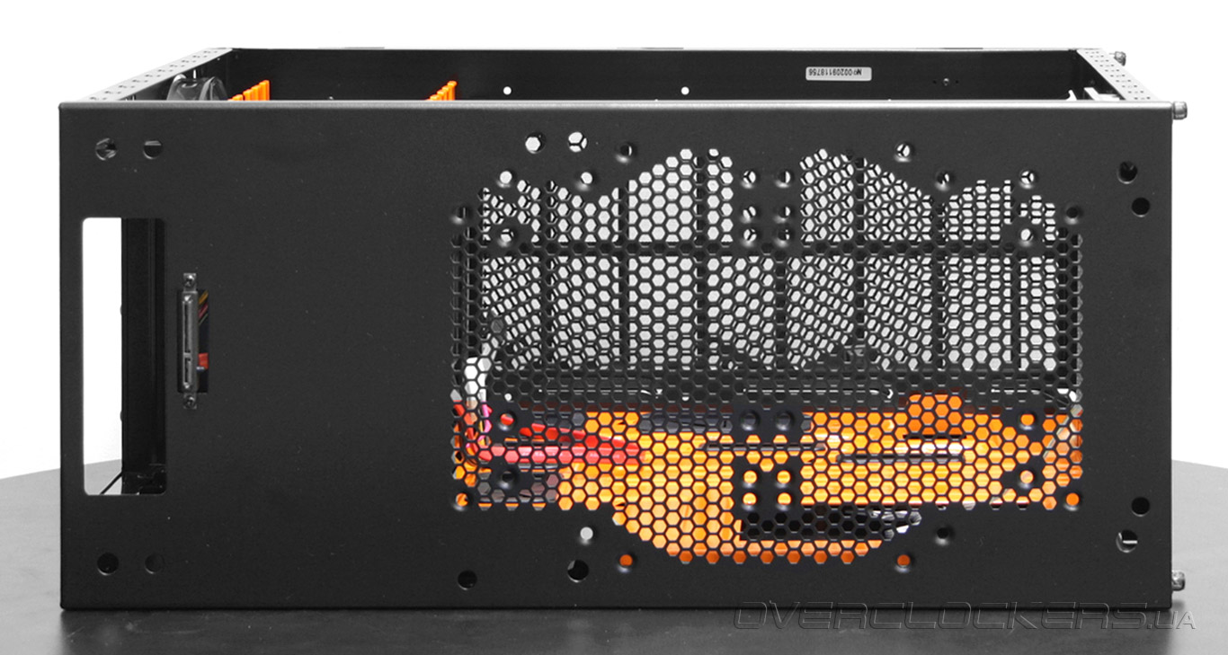 На передней части шасси размещен огромный 20-сантиметровый фронтальный вентилятор с крыльчаткой оранжевого цвета.