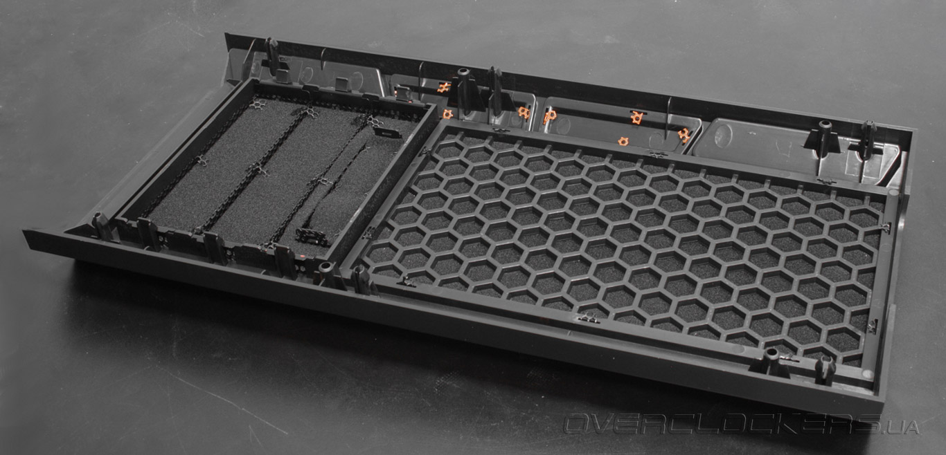 Поддон материнской платы выполнен из стального листа, в котором предусмотрен целый ряд штампованных отверстий и возвышений, призванных упростить монтаж комплектующих и укладку проводов, причем отверстия для кабелей прикрыты специальными резиновыми манжетами.