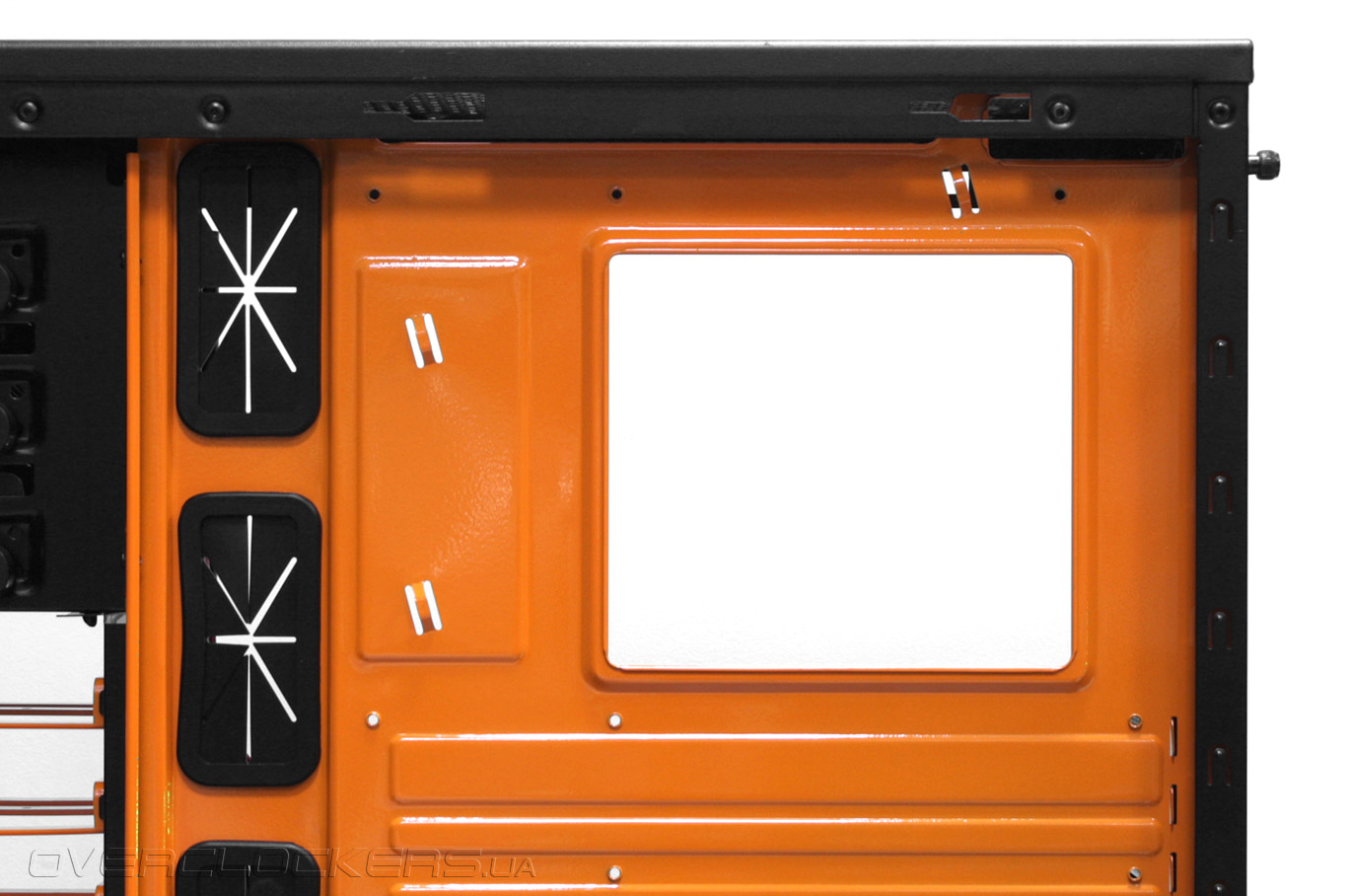Верхняя пластиковая панель также легко демонтируется, освобождая доступ к монтажу вентиляторов на верхнюю часть шасси.