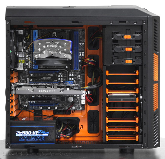 Внутреннее устройство корпуса выполнено стандартно, как для современных корпусов формата Middle-Tower. Блок питания размещается в нижней части шасси.