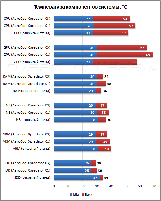 Корпуса, размером подобные Aerocool Xpredator X3, имеют некоторое преимущество перед стандартными Middle-Tower за счет большего объема воздуха и более свободной его циркуляции. Действительно, герой сегодняшнего обзора практически не уступает по эффективности открытому тестовому стенду, и это при том, что установлено всего два комплектных вентилятора.
